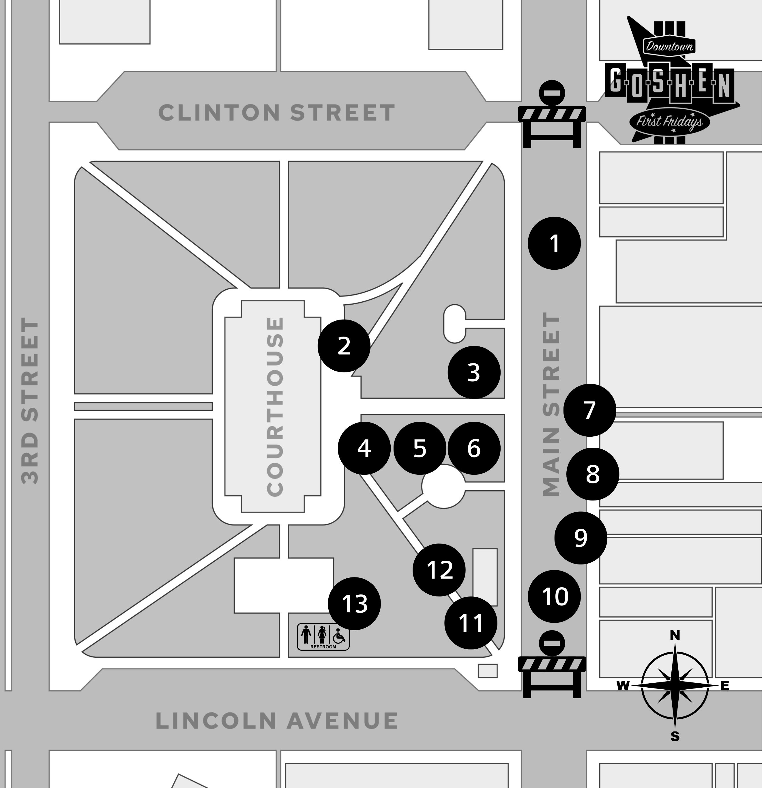 Map Key: 1. Food Trucks | 2. Miller Poultry Main Stage | 3. Chill Zone | 4. Information Table | 5. Face-Painting | 6. Youth Stein-Holding Contest | 7. Volkswagen Showcase Entrance | 8. Volkswagen Showcase | 9. 21+ Stein-Holding Contest, Costume Contest | 10. Goshen Brewing Co. Beer Garden | 11. Hammerschlagen | 12. Well-Crafted Artisan Showcase | 13. Goshen Health Mother’s Tent